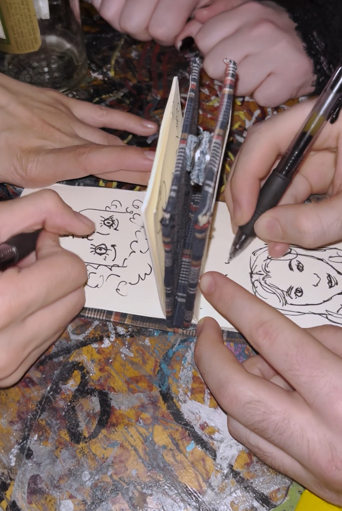 Draw Each Other, involves a double-sided notebook I bound. Below is a short film I created inviting patrons at Coles bar to draw portraits of each other in one minute. Above are some stills from this film.